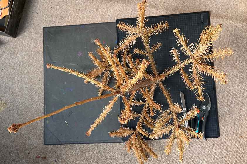 - Säge die Spitze eines Weihnachtsbaums ab. Ein Ring aus Ästen soll noch dran sein.