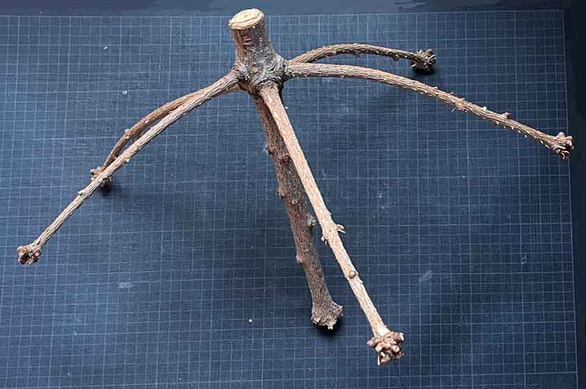 - Wenn die beiden Äste, auf denen der Kreisel gerade liegt, hoch in die Luft stehen, kannst du sie dort etwas einkürzen. Drehe den Kreisel und kürze so alle Äste, die überstehen etwas ein.