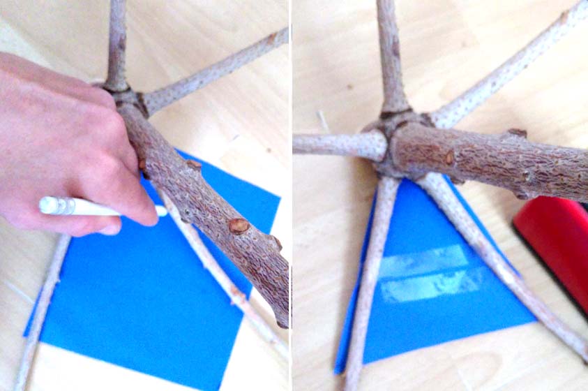 - Klebe die Papiere mit Klebeband zwischen den Ästen fest.