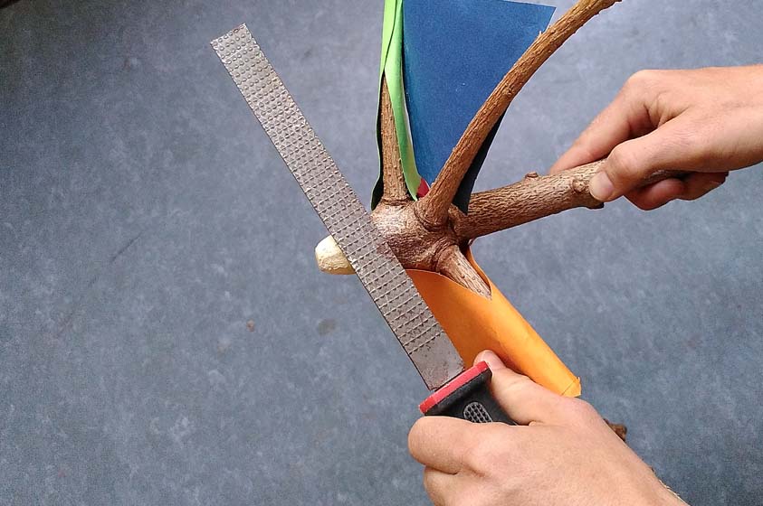 - Schnitze das dicke Ende des Stamms spitz zu. Probiere, bis er sich gut drehen lässt. Vielleicht möchtest du hierfür auch die Feile verwenden? Probiere, was besser geht.