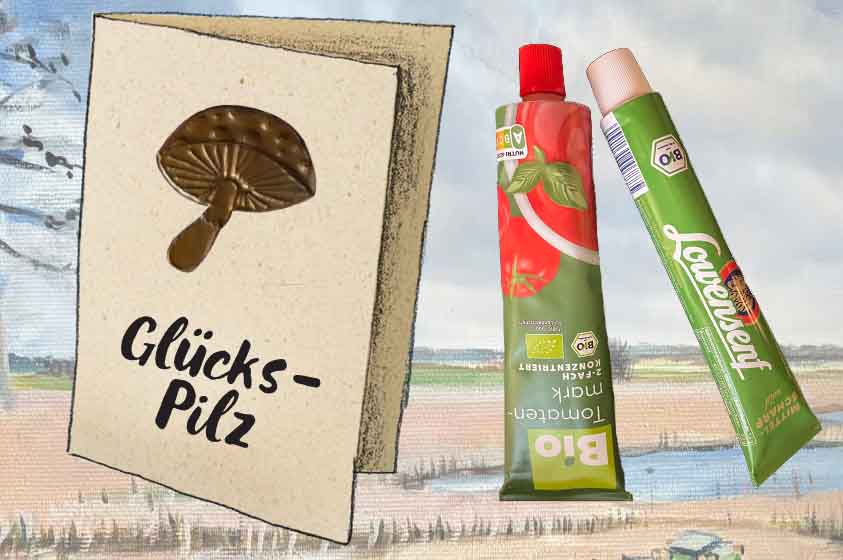 Aus einer leeren Metalltube könnt ihr eine tolle Glückspilz-Karte basteln! Einfach die Tube in Form schneiden, verzieren und aufkleben – schon habt ihr eine selbstgemachte Karte mit einem besonderen, glänzendem Element.